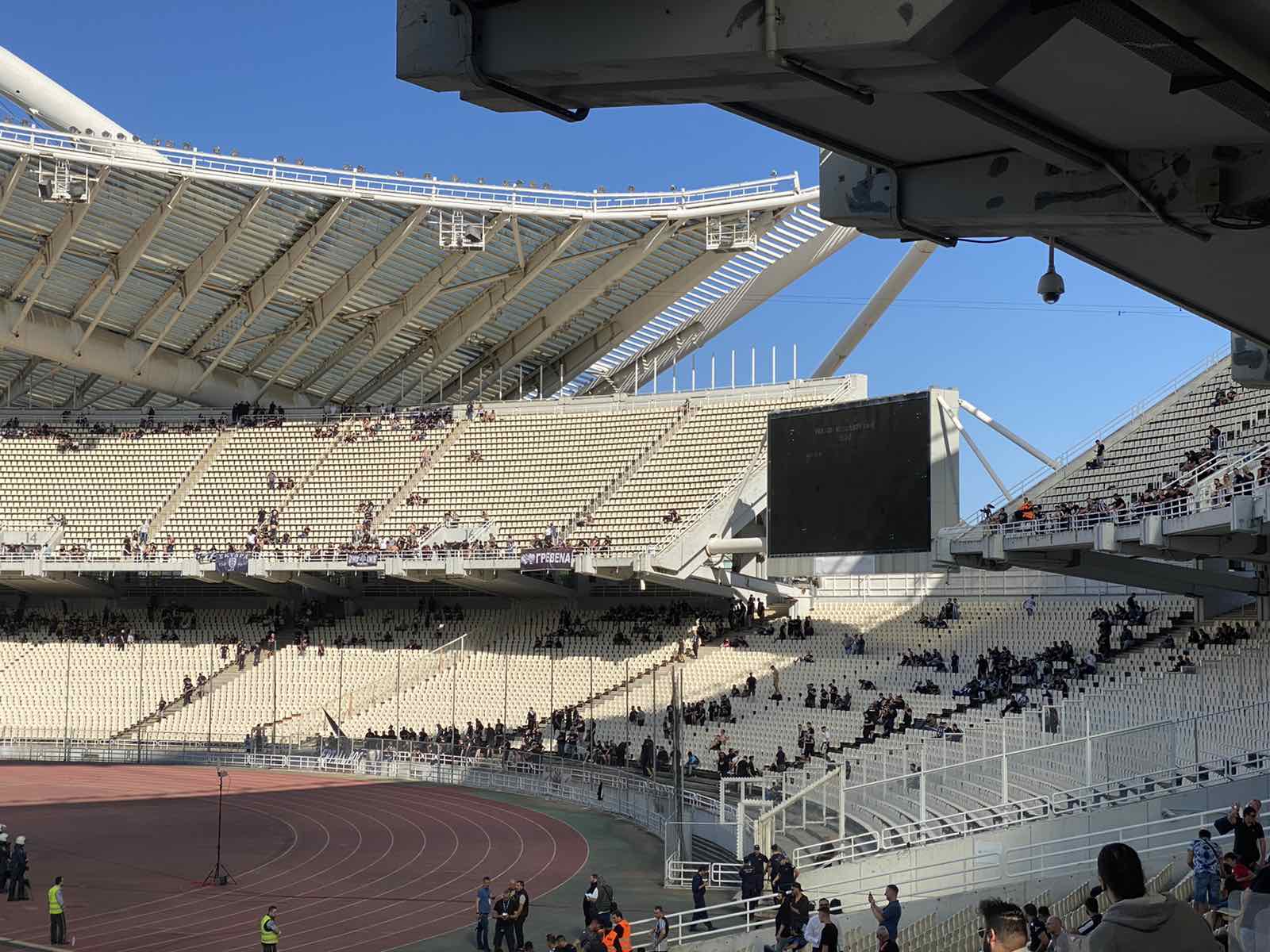 Ένα τεράστιο πανό στο πάνω διάζωμα στις θύρες που τους φιλοξενούσε άπλωσαν οι οργανωμένοι οπαδοί του Δικεφάλου. «Ναι στις μετακινήσεις των οπαδών, όχι στις αλλ… ιες...
