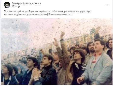 «Eίπε να επιστρέψει για λίγο, να περάσει μια τελευταία φορά από γνώριμα μέρη και να συνεχίσει πιο χαρούμενος το ταξίδι στην αιωνιότητα…», ανέφερε στο μήνυμά του ο Λευτέρης Δούκας.